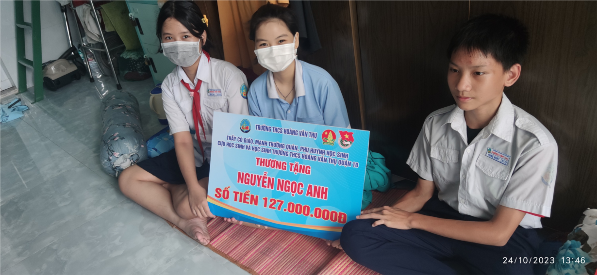 Trong đợt hưởng ứng Chương trình “Thắp sáng ước mơ Thiếu nhi Việt Nam” năm nay (phát động từ ngày 25/9/2023 đến hiện tại) thì nhà trường đã nhận được số tiền là 128.832.000 đồng từ quý thầy cô, các em học sinh, các cựu học sinh và các mạnh thường quân gửi tặng em Nguyễn Ngọc Anh. Và chiều ngày 24/10/2023 thầy Dương Văn Hoàng – Tổng phụ trách Đội, thầy Châu Chí Vinh – Giáo viên chủ nhiệm lớp 9.7, cùng một phụ huynh của lớp 7.11, hai phụ huynh của lớp 9.7 và hai bạn học sinh lớp 9.7 – cùng lớp của Ngọc Anh đã đến tận nhà để trao tặng số tiền mà tất cả mọi người đã yêu thương gửi đến em.