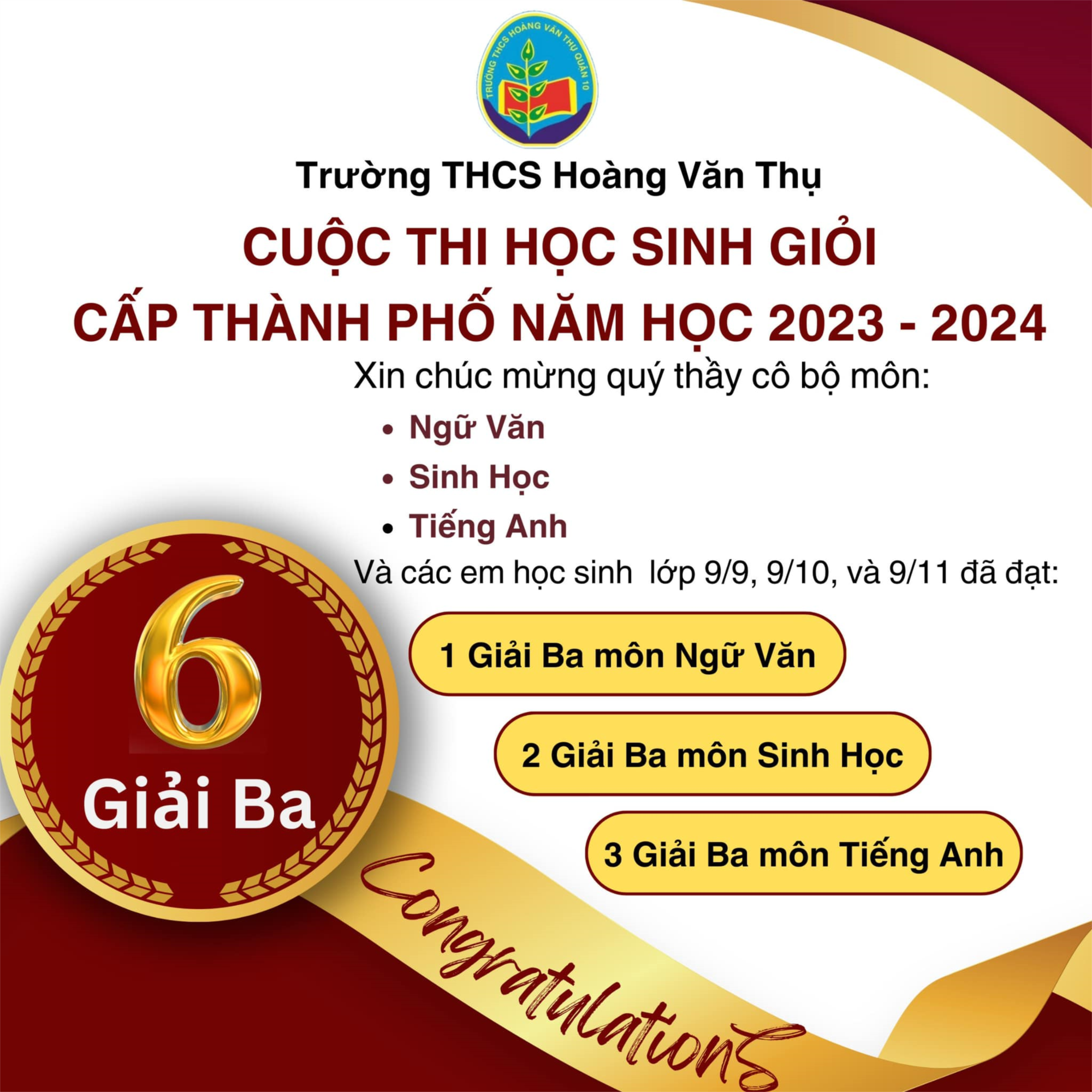 Nhà trường xin chúc mừng các Thầy Cô giáo cùng các em học sinh đã đạt được kết quả xuất sắc trong kì thi HSG LỚP 9 CẤP THÀNH PHỐ năm học 2023 - 2024.